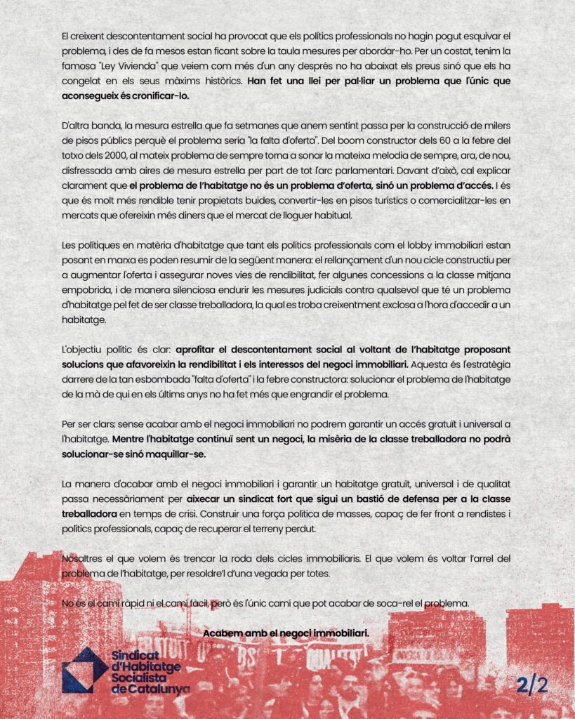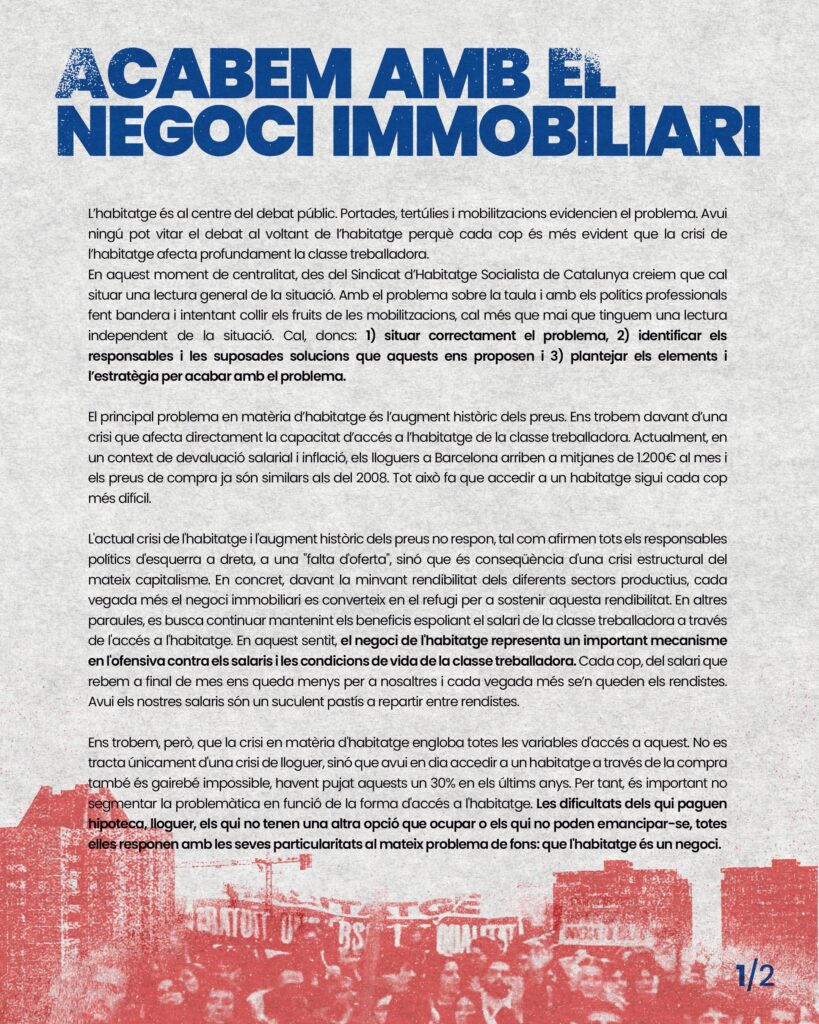 L’11 de desembre es va presentar la campanya política del Sindicat d’Habitatge Socialista de Catalunya amb el lema de “Acabem amb el negoci immobiliari” amb l’objectiu de situar un relat que assenyala l’arrel del problema de l’habitatge i als seus responsables.